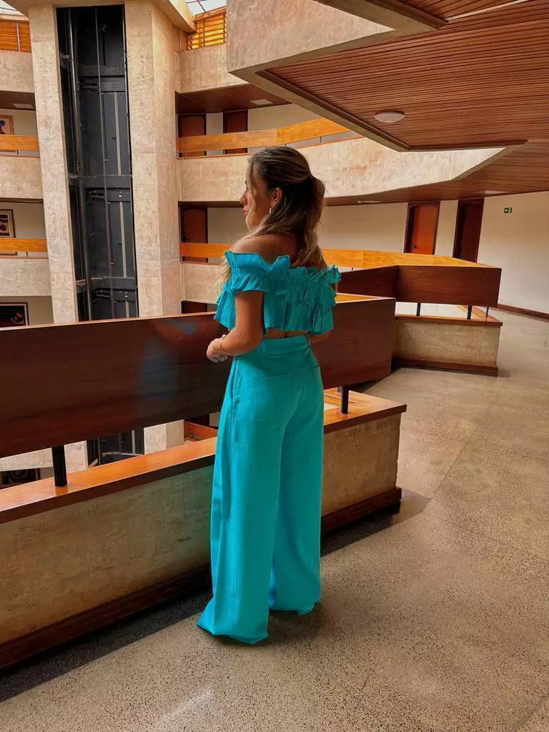 Calça cós médio em linho misto, modelagem ampla nas pernas e detalhes em pences abaixo do cós, com bolsos laterais e atrás. Letícia usa PP.