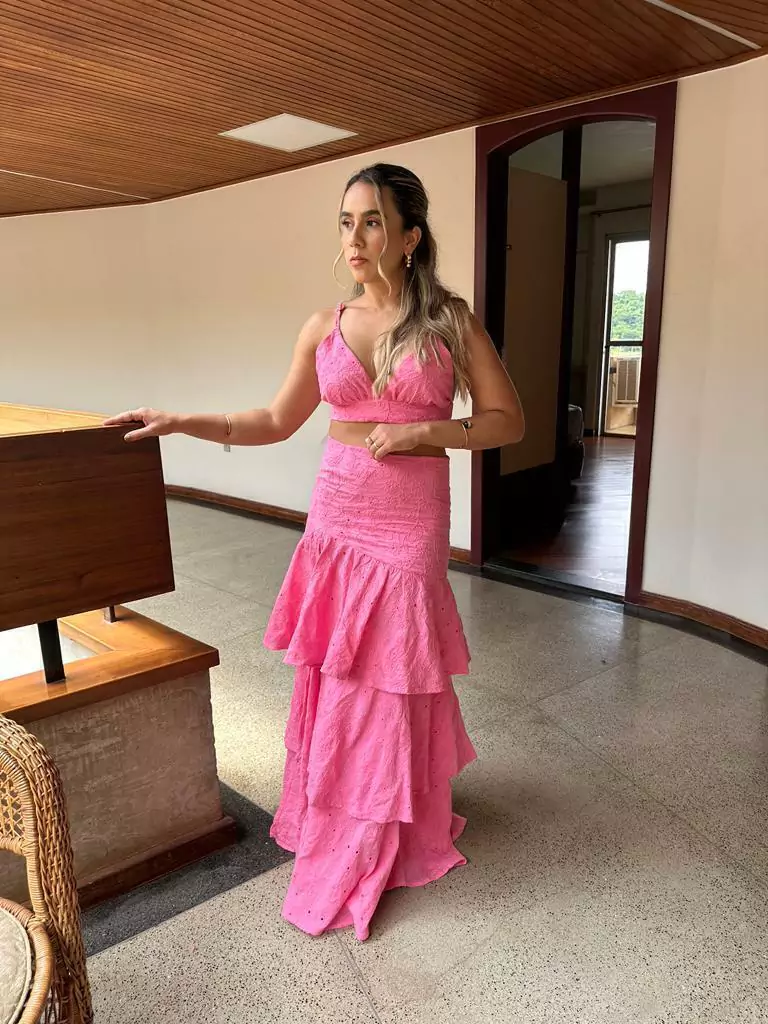 Conjunto de saia babados com fenda e top cropped com amarração nas costas. Feito em uma nobre cambraia de algodão bordada. Letícia usa PP.