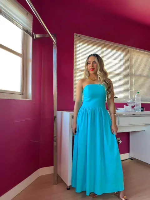 Vestido feito em um linho misto, tomara que saia recorte acompanhando a cintura e saia ampla com barra larga. Visto PP